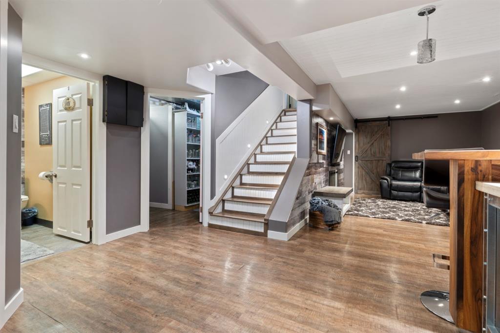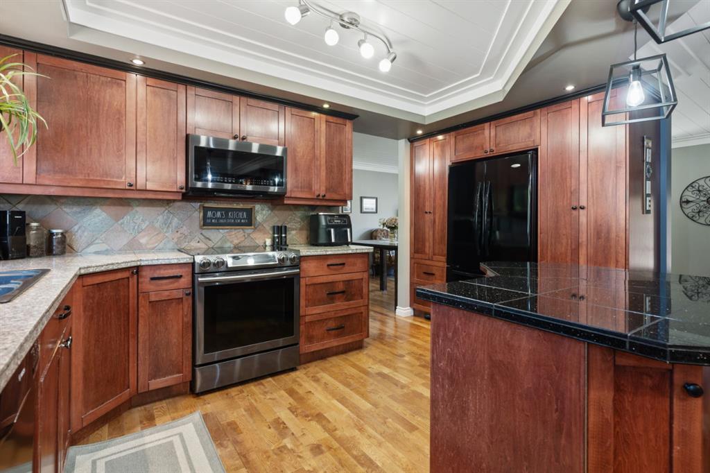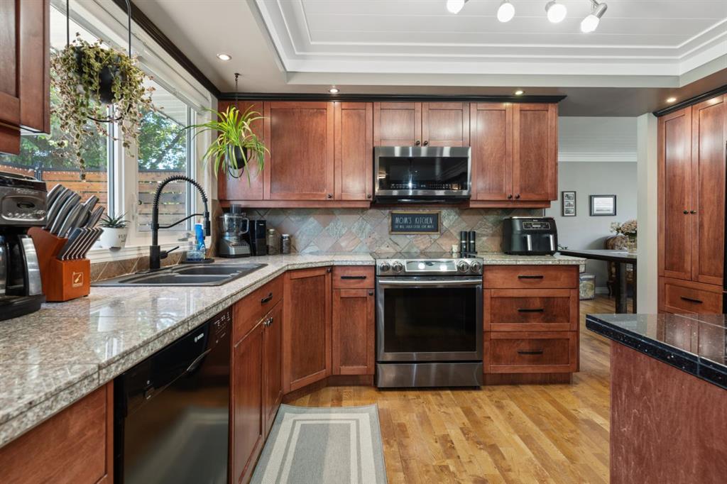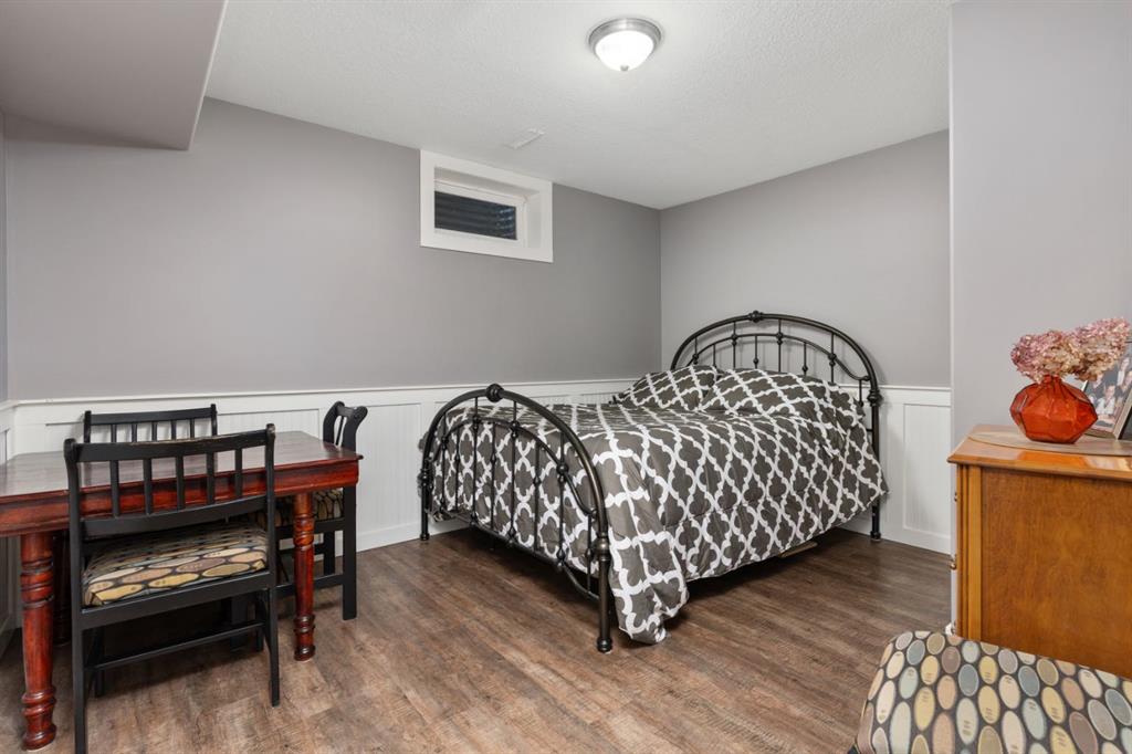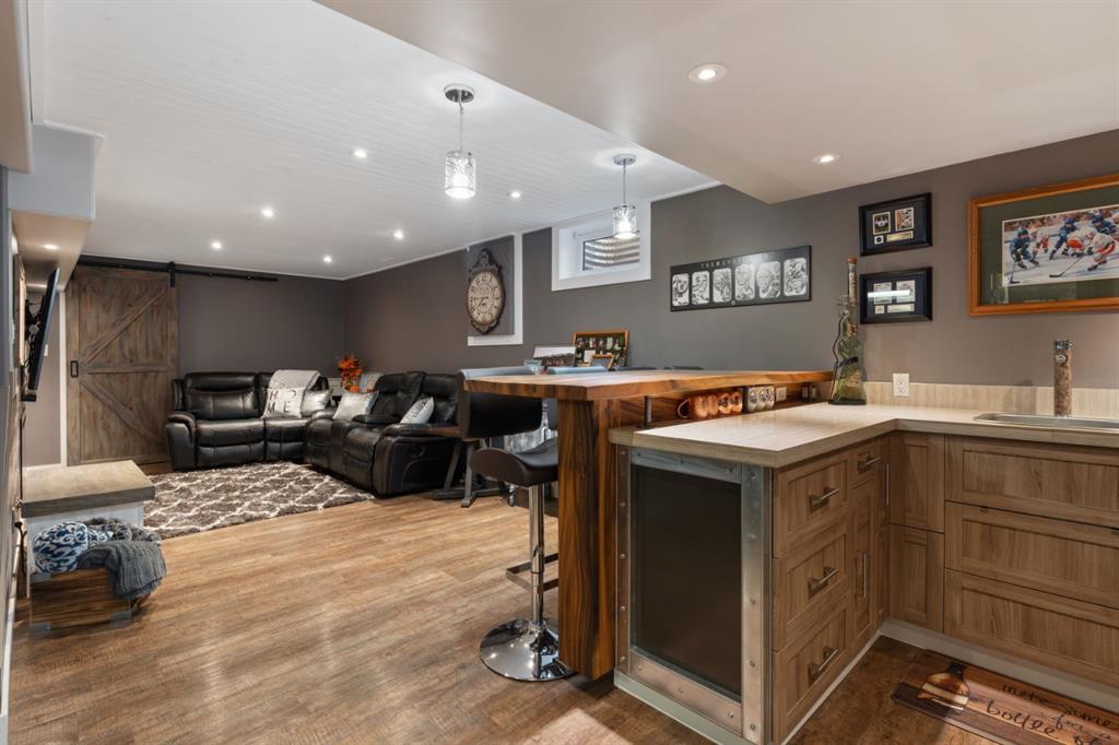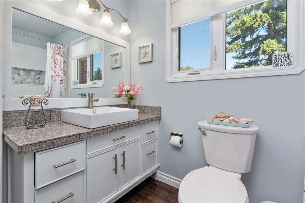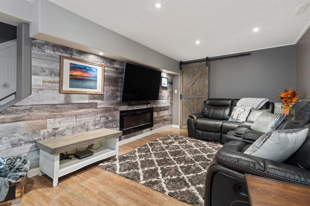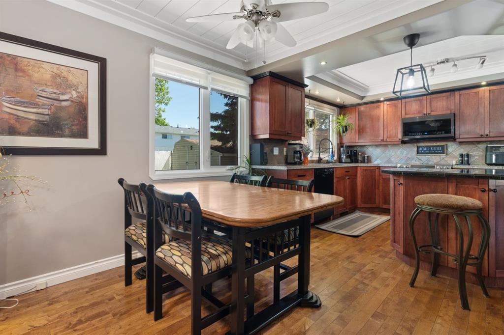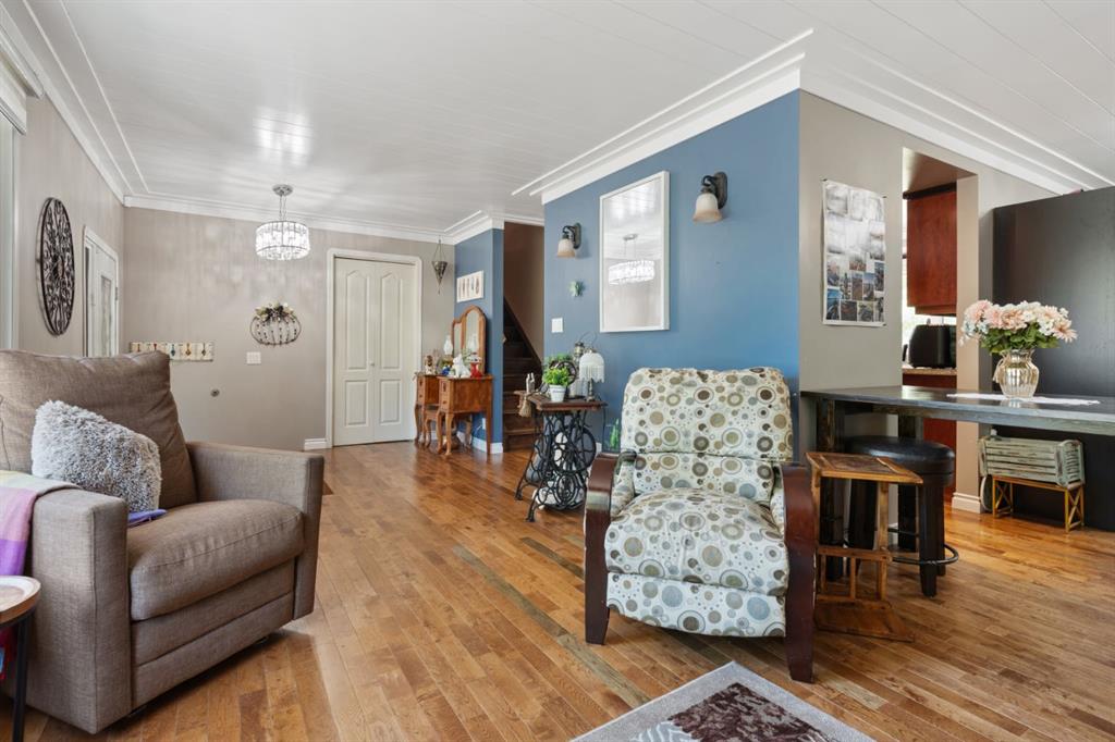 Welcome Home to 4313 - 66 St - a True Show Stopper! Step into comfort and style with this beautifully renovated home that blends timeless charm with modern upgrades. Perfect for families, this property offers a warm, welcoming atmosphere with thoughtful features throughout. Custom Cabinetry and granite tile counters, updated vinyl windows, rich hardwood flooring, doors/trims, pex plumbing, wainscotting, crown mouldings, custom wood features and so much more. From the bright West Facing living room you find a dedicated home office that could be converted back to a dining area as needed although there is a dinette off of the Fully Updated Custom Kitchen. Relax around the wood stove insert fireplace with beautiful stone finish or duck through the slider doors to a private covered deck with gas line for fire pit and roll down screens to keep out the wind. Around the corner you'll find a wonderful back entry, with outdoor and garage access, a 2pc bath for guests and handy laundry with built-in cabinetry. Follow the Hardwood Floors upstairs to find 3 well appointed bedrooms - the Primary with a beautiful custom 4pc ensuite - and an additional fully renovated 4pc bathroom. Retire to the fully renovated basement for the big game and enjoy in the custom bar and family room. You'll also find a 4th bedroom, a 3pc bathroom, Flex room and what every home of this size needs - a Huge Storage room. Enjoy the outdoors with mature trees, low maintenance front patio and back covered deck, stone paver walkways, a private hot tub area (hot tub negotiable), a handy shed and fenced with gate for future parking. Finally you'll find an attached 22x24 Heated Garage with built-in workbench and shelving. This home has been meticulously planned and masterfully updated - you'll love coming home.